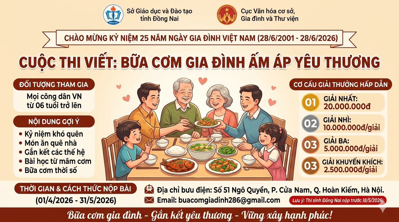 Hưởng ứng các hoạt động kỷ niệm 25 năm Ngày Gia đình Việt Nam (28/6/2001 – 28/6/2026), Bộ Văn hóa, Thể thao và Du lịch đã ban hành Kế hoạch tổ chức Cuộc thi viết với chủ đề “Bữa cơm gia đình ấm áp yêu thương”, nhằm tôn vinh những giá trị văn hóa truyền thống tốt đẹp của gia đình Việt Nam và lan tỏa ý nghĩa thiêng liêng của bữa cơm gia đình trong đời sống xã hội.
