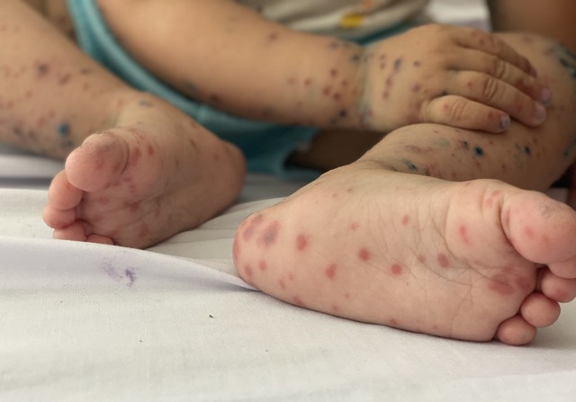 Theo ngành y tế, các biểu hiện thường gặp của bệnh bao gồm sốt nhẹ, mệt mỏi, chán ăn, đau họng và nổi các nốt phỏng nước trên da và niêm mạc. Ban đầu, trẻ có thể xuất hiện các chấm đỏ, sau 1–2 ngày phát triển thành bọng nước, khi vỡ ra sẽ tạo thành các vết loét. Các tổn thương thường xuất hiện ở lòng bàn tay, bàn chân, miệng, lưỡi và mặt trong má.